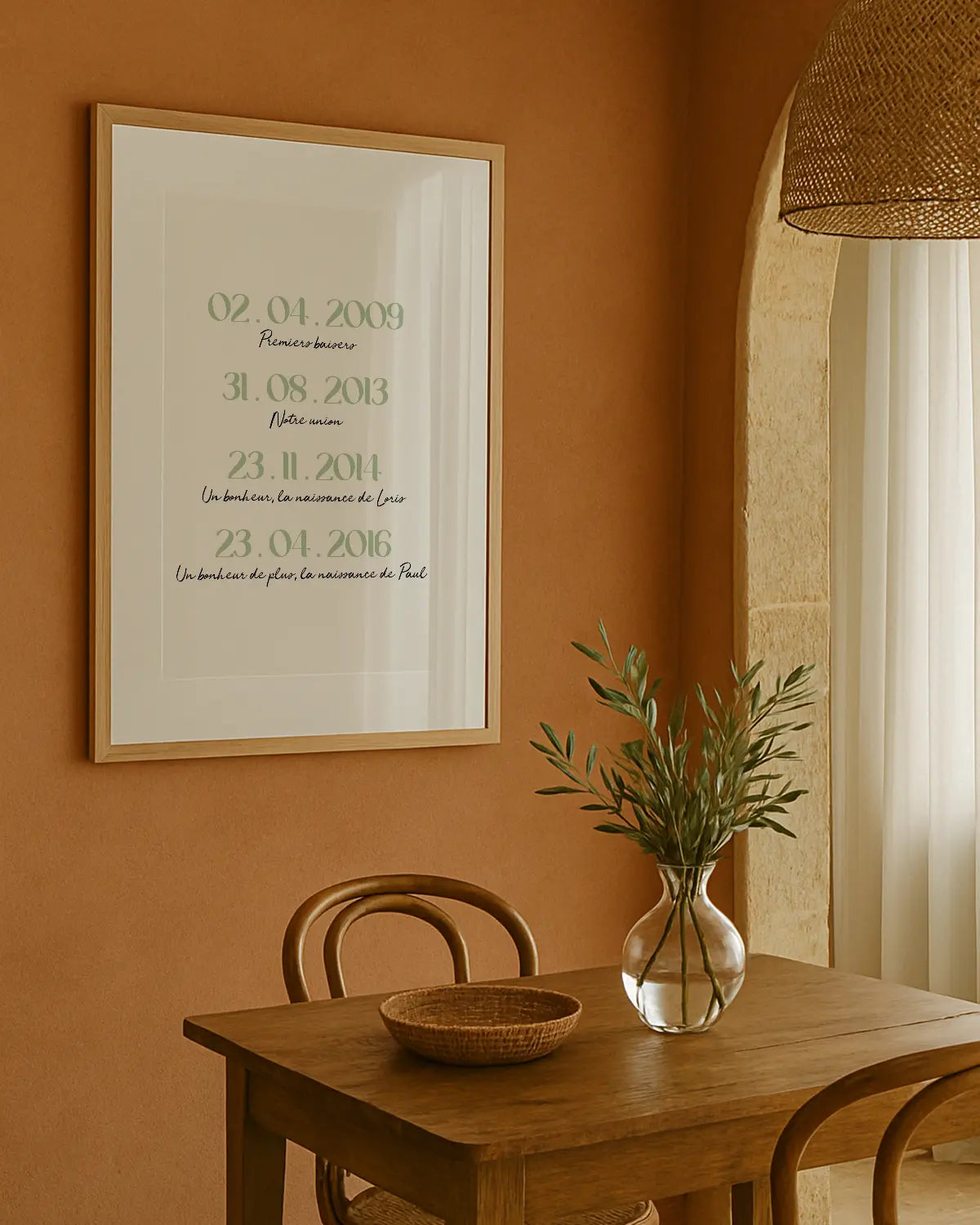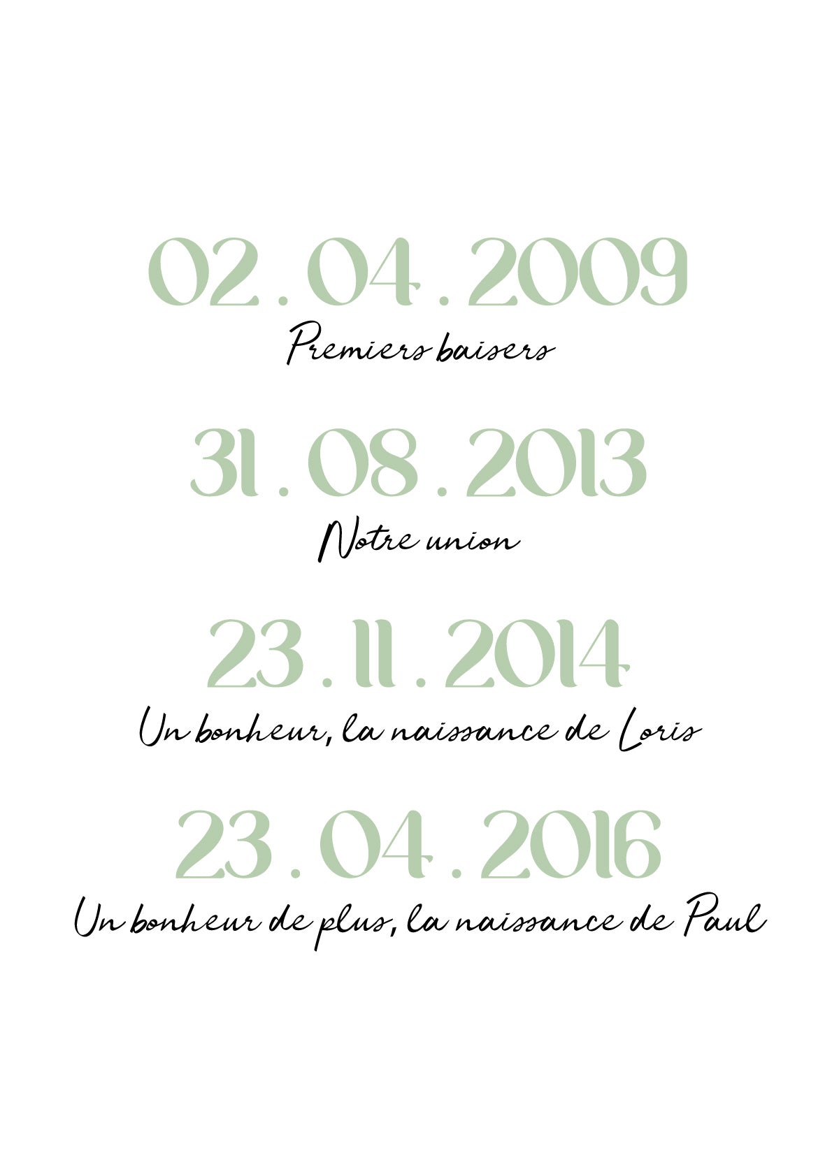 L’affiche Nos Dates clés rassemble les grands moments de votre vie, en une création unique et personnalisée.